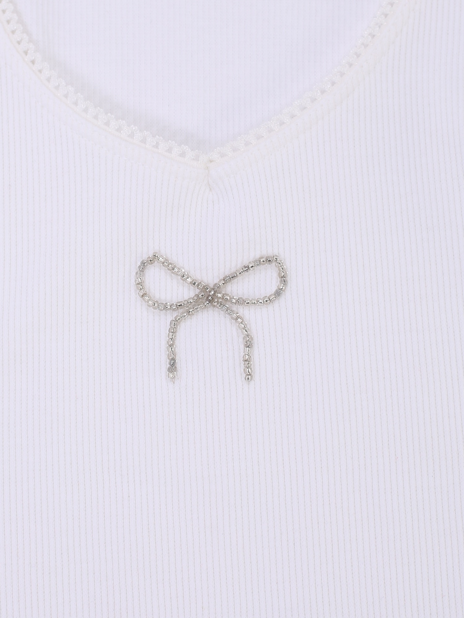 - Leuke details zijn het strikje van kleine kraaltjes op de borst en het broderie randje.